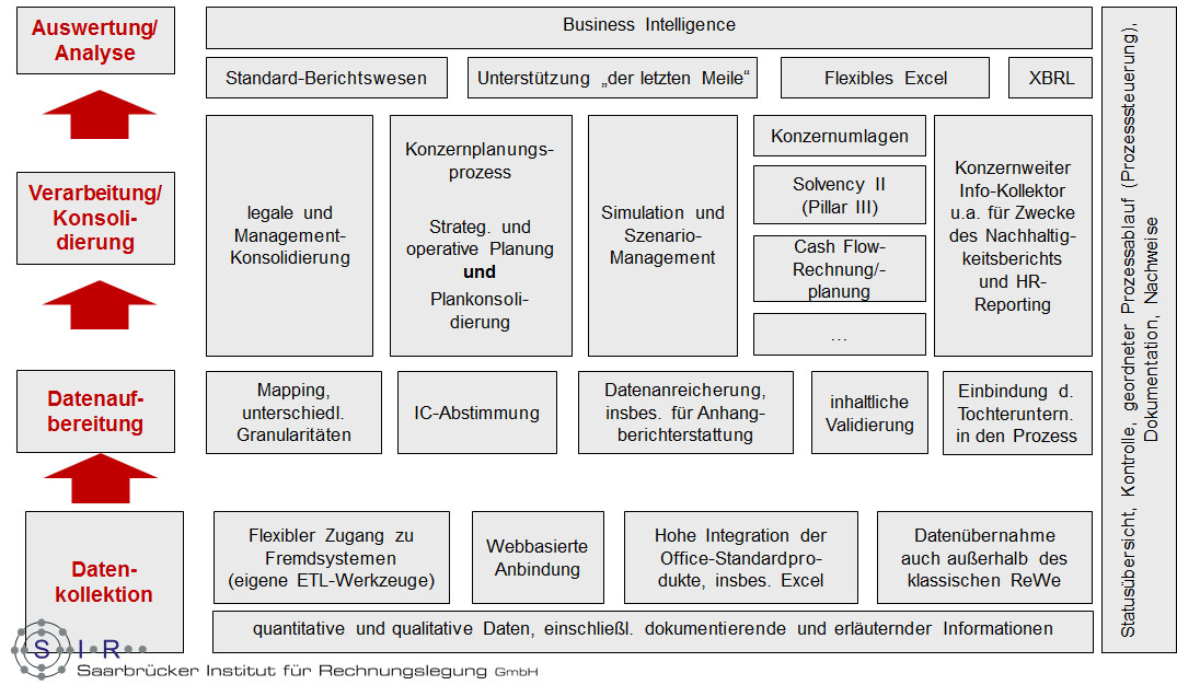 - Ein wesentliches Merkmal der Software ist, dass Standardprozesse der Konzernrechnungslegung (hier insbesondere die Kapitalkonsolidierung) und -planung über herstellerseitig programmierte Funktionalitäten umgesetzt werden können. Gleichzeitig ist die Flexibilität einer regelbasierten Verarbeitung verfügbar.